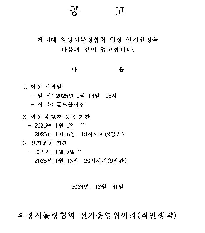 종목단체 관련 공고 | 의왕시 볼링협회장 공고 및 결격사유 게시 페이지 정보 작성자 의왕시체육회 작성일25-01-02 17:47 조회961회 댓글0건 이전글 다음글 목록 본문 . 댓글목록 등록된 댓글이 없습니다. 이전글 다음글 목록